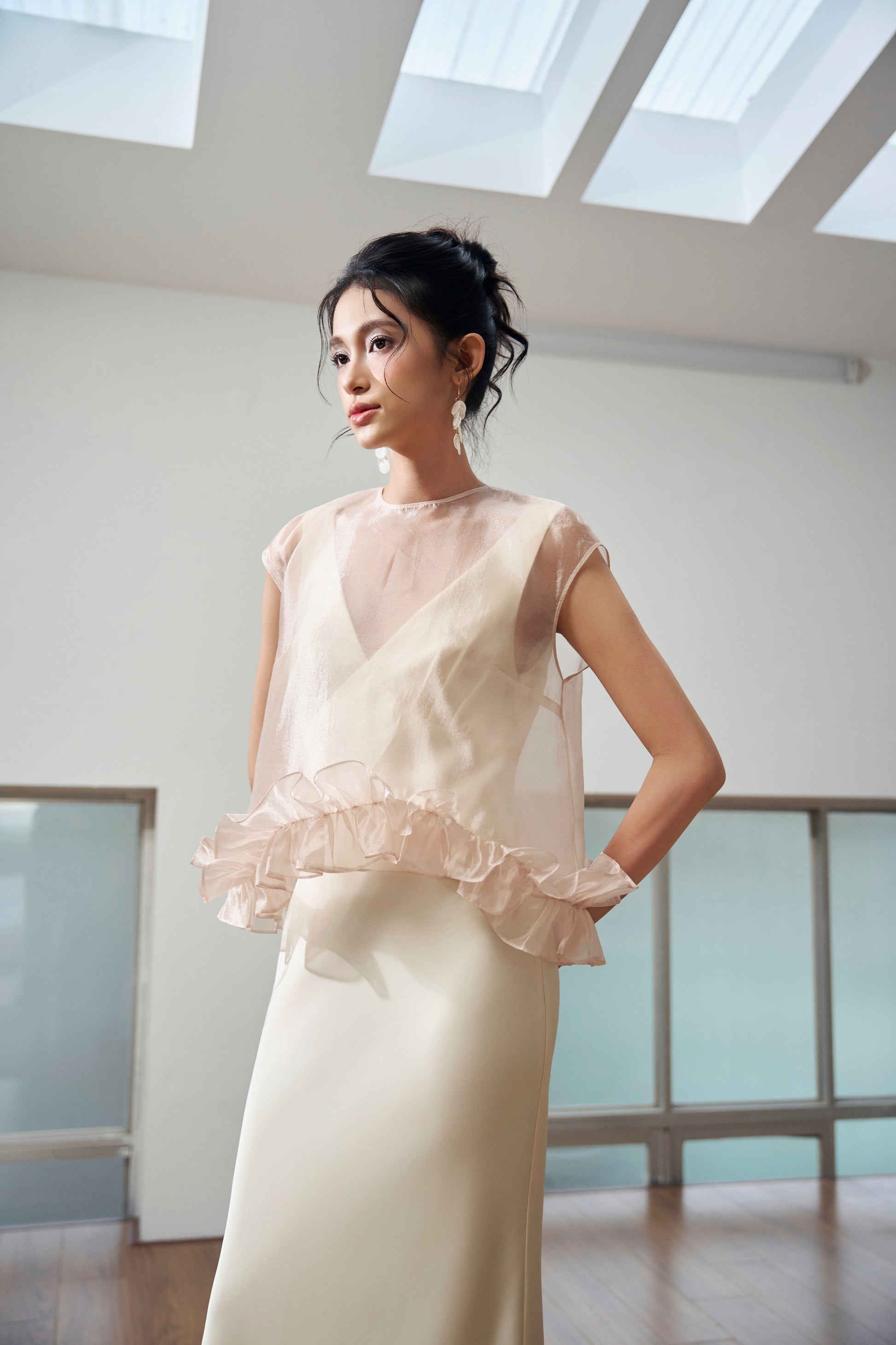 - 胸元や腕をさりげなくカバーしつつ、フェミニンな印象をキープ