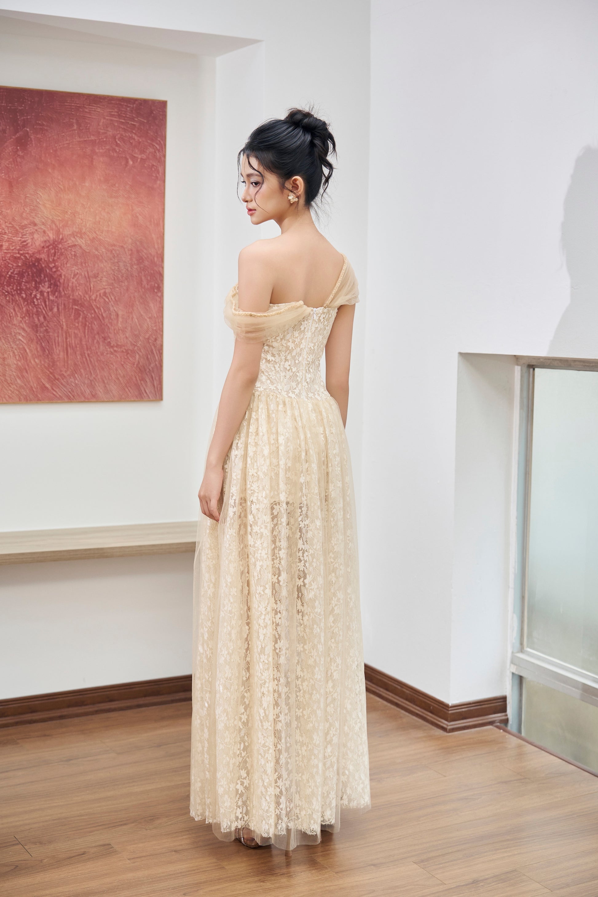 Marigoldドレスは、甘くロマンティックな雰囲気を纏うチュール×レースオフショルダードレス。繊細なレースの上に軽やかなチュールを重ね、透け感のある柔らかな印象を演出します。プリンセスのようなオフショルダーがデコルテと肩のラインを美しく引き立て、可憐さと上品な魅力を兼ね備えた一着です。軽やかなシルエットが動くたびに揺れ、女性らしさと優雅さを際立たせます。
