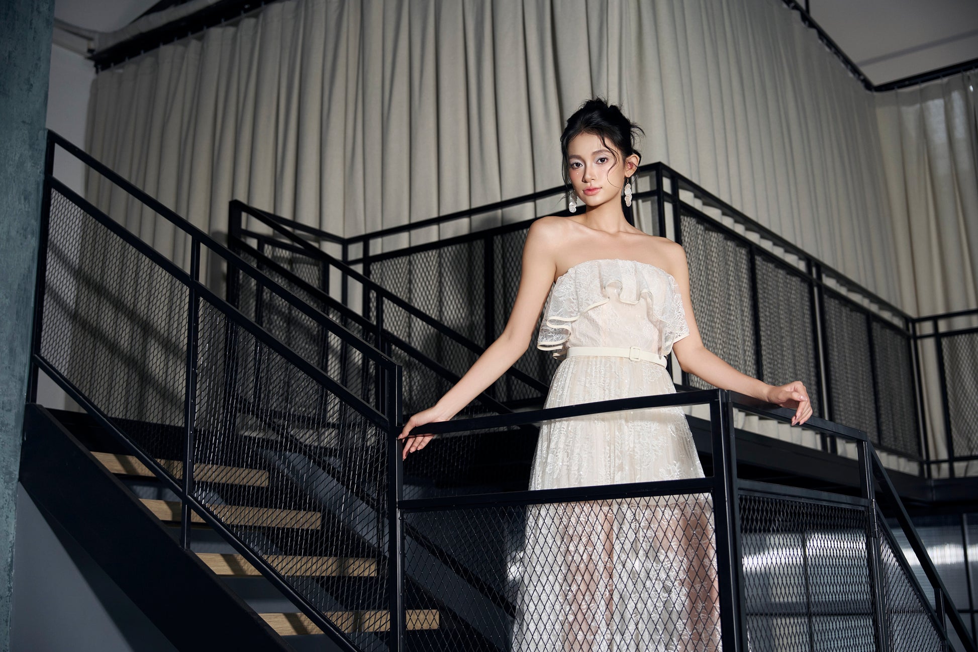 Mistドレスは、クラシックな美しさと洗練された気品を兼ね備えたロングレースドレス。上質なレースに繊細なスパンコールを散りばめ、動くたびに柔らかく光を反射し、上品な輝きを放ちます。胸元にはホワイトのフリルトリムをあしらい、フェミニンで優雅な印象を演出。ウエストを軽くシェイプさせ、下に向かってしなやかに広がるシルエットが、女性らしさと優雅さを引き立てます。上品な色合いと繊細なレース模様が調和し、パーティーやフォーマルなシーンにふさわしい一着です。
